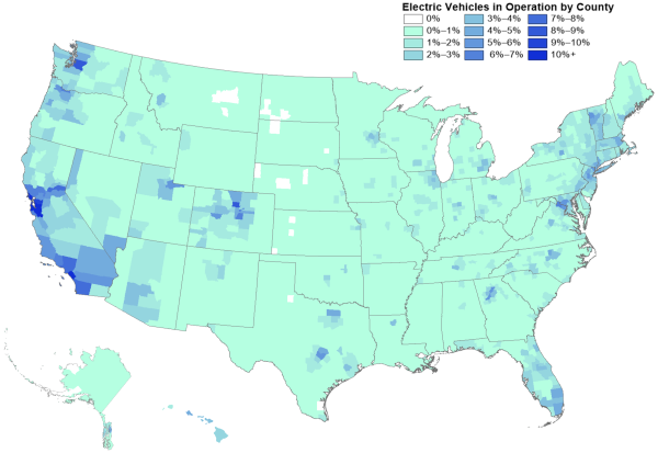 - Half of all registered EVs were located in just 42 counties (1.4 percent of all counties).